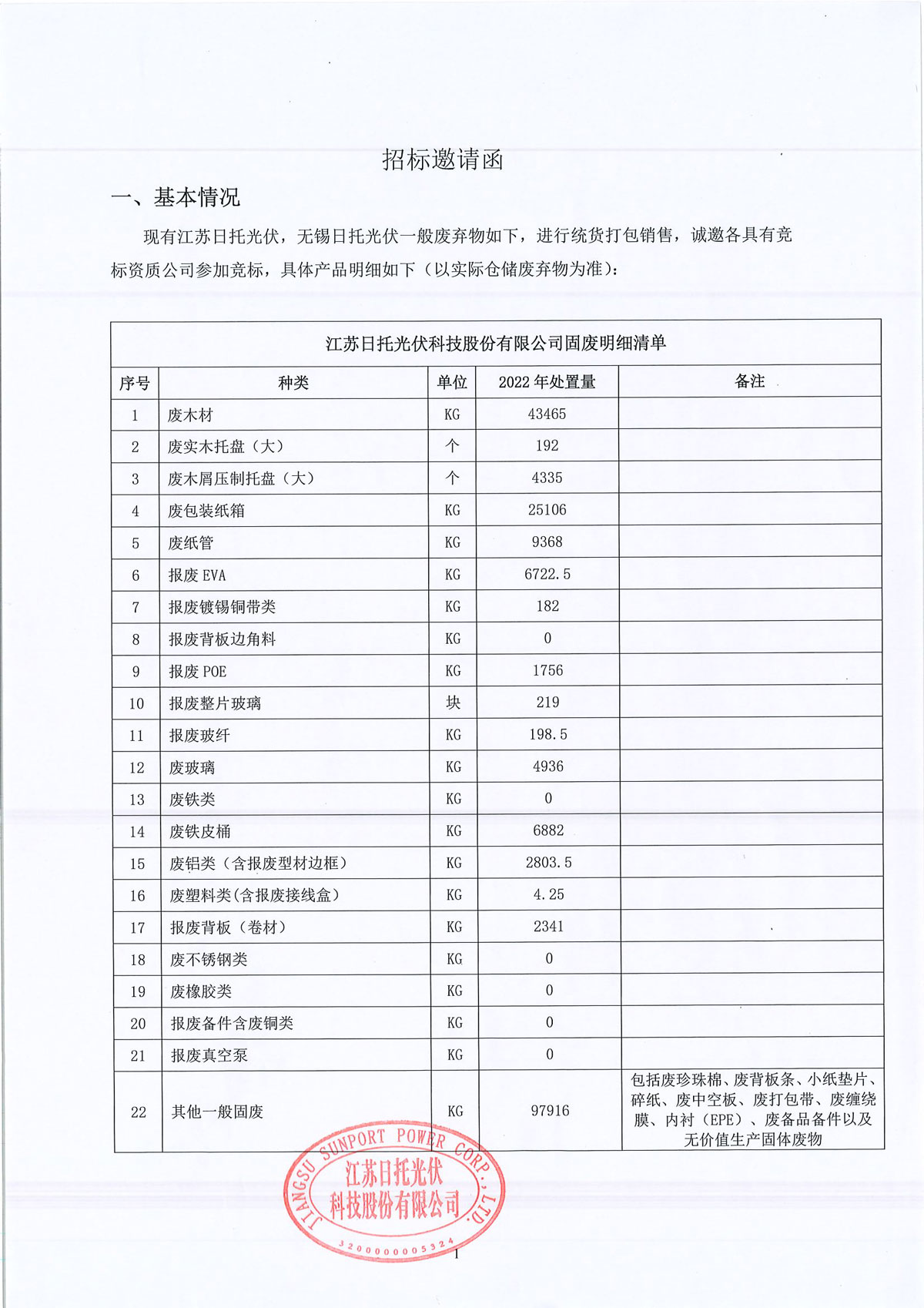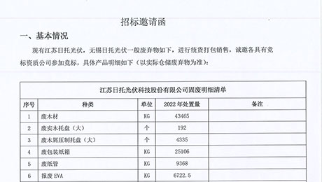 江蘇日托光伏科技股份有限公司現(xiàn)對倉儲部一般固廢實施公開招標。竭誠邀請廣大信譽好、具備廢舊物品回收資質(zhì)的供應商積極參與投標。