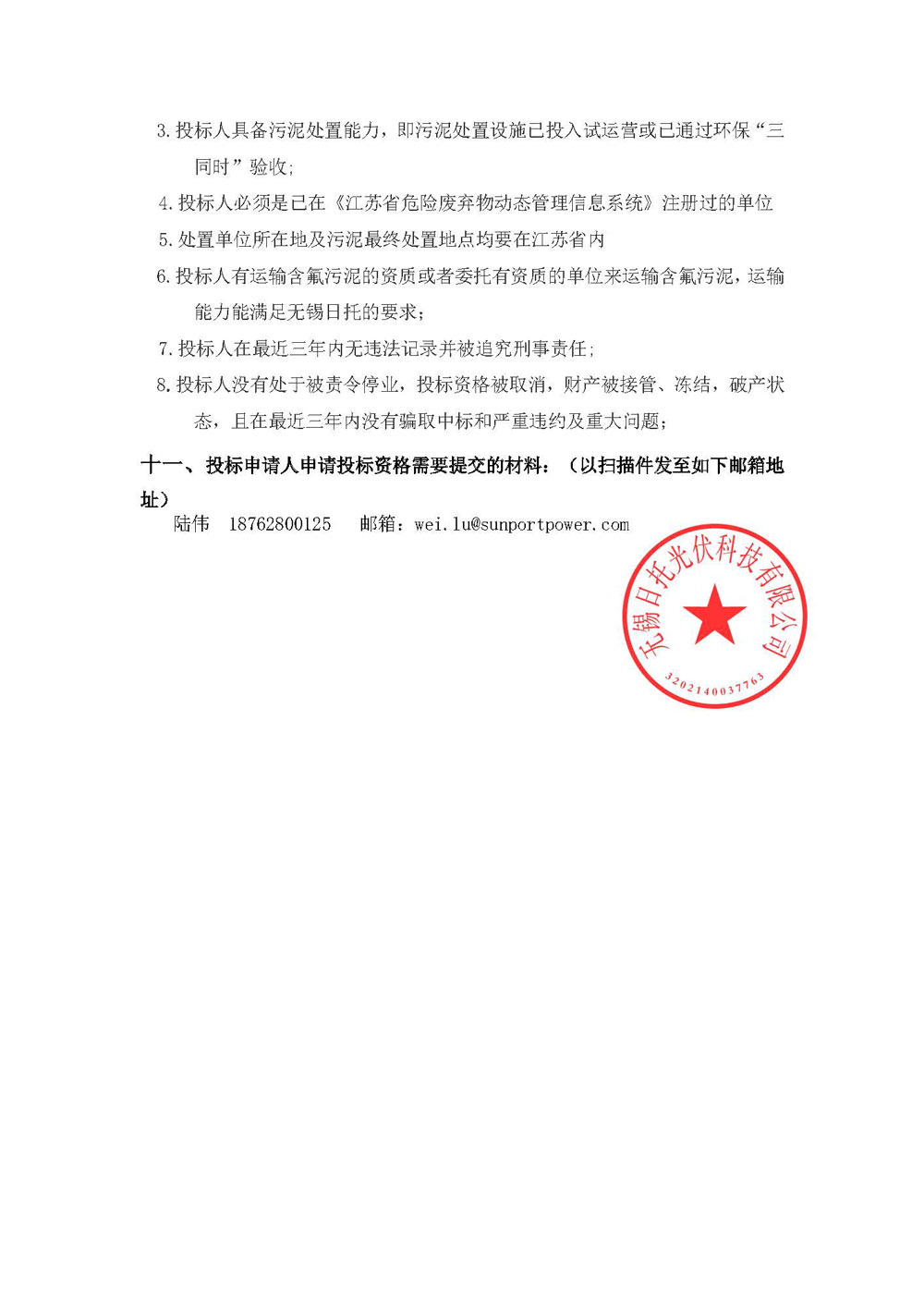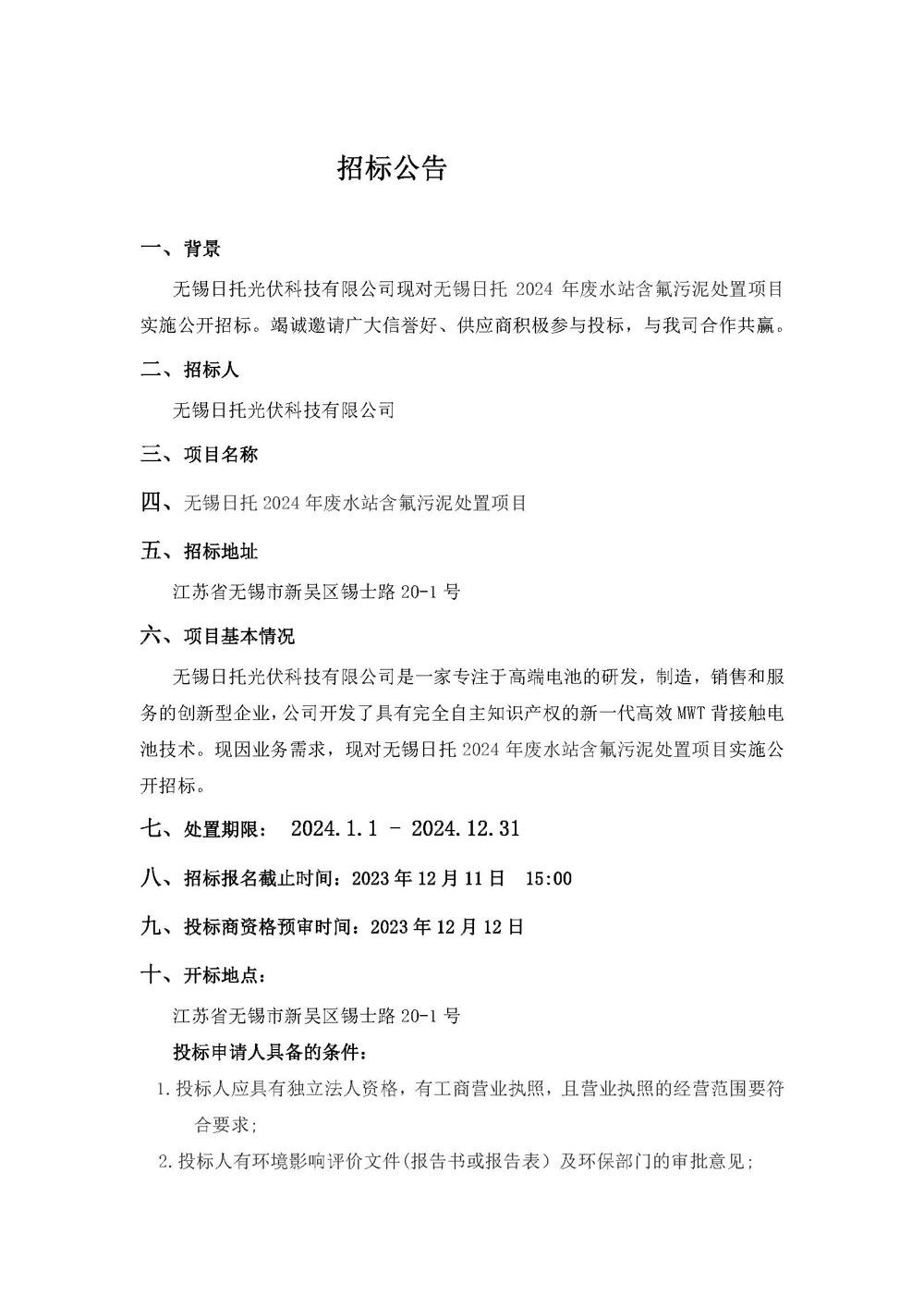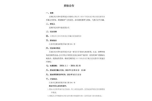 無錫日托光伏科技有限公司現對無錫日托 2024 年廢水站含氟污泥處置項目實施公開招標。竭誠邀請廣大信譽好、供應商積極參與投標,與我司合作共贏。