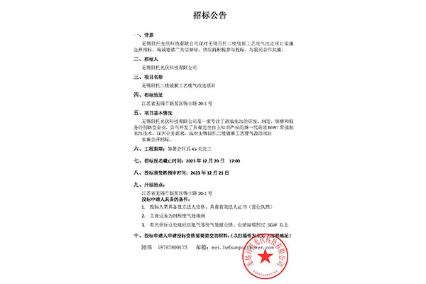 無錫日托光伏科技有限公司現對無錫日托二樓鍍膜工藝廢氣改造項目實施公開招標。竭誠邀請廣大信譽好、供應商積極參與投標,與我司合作共贏。