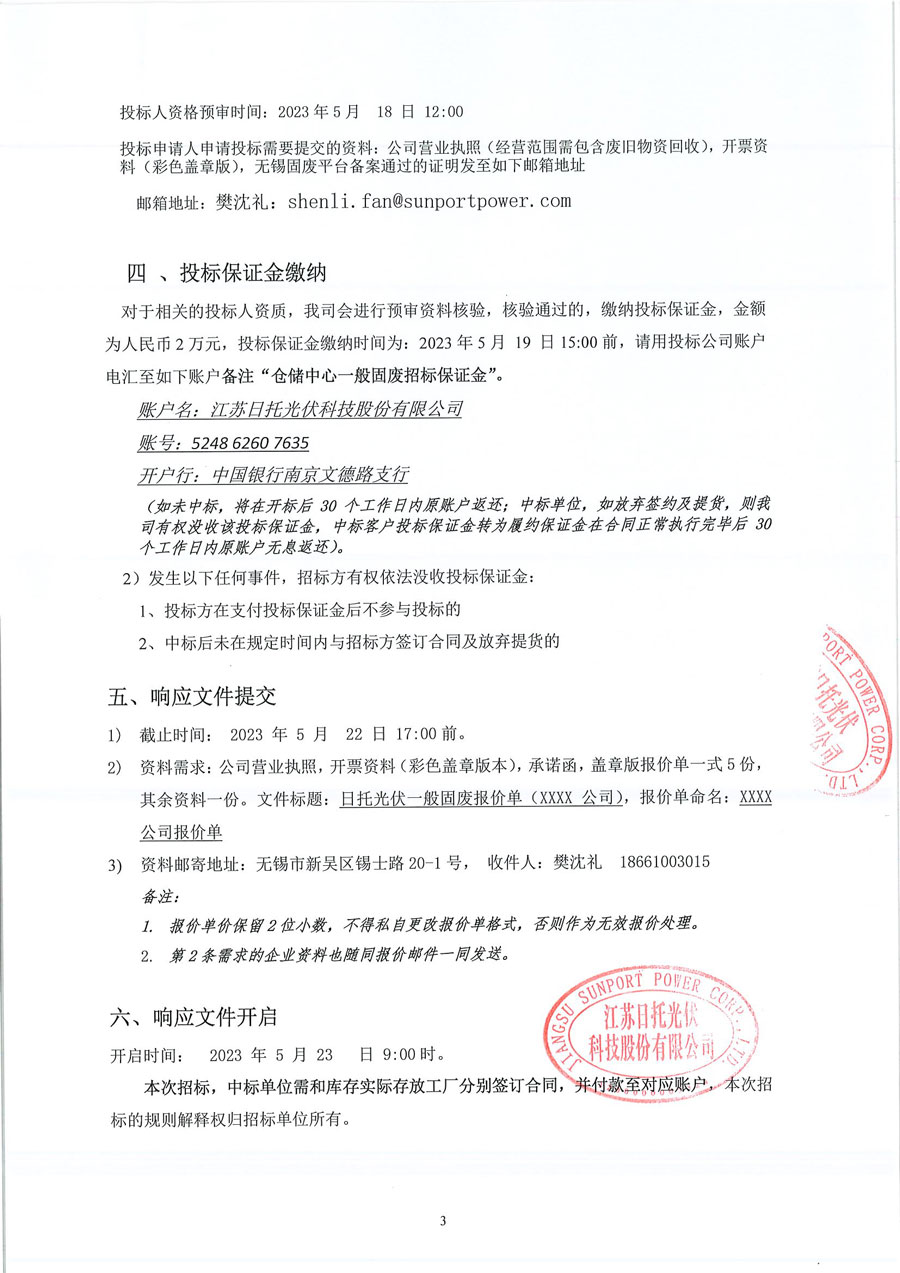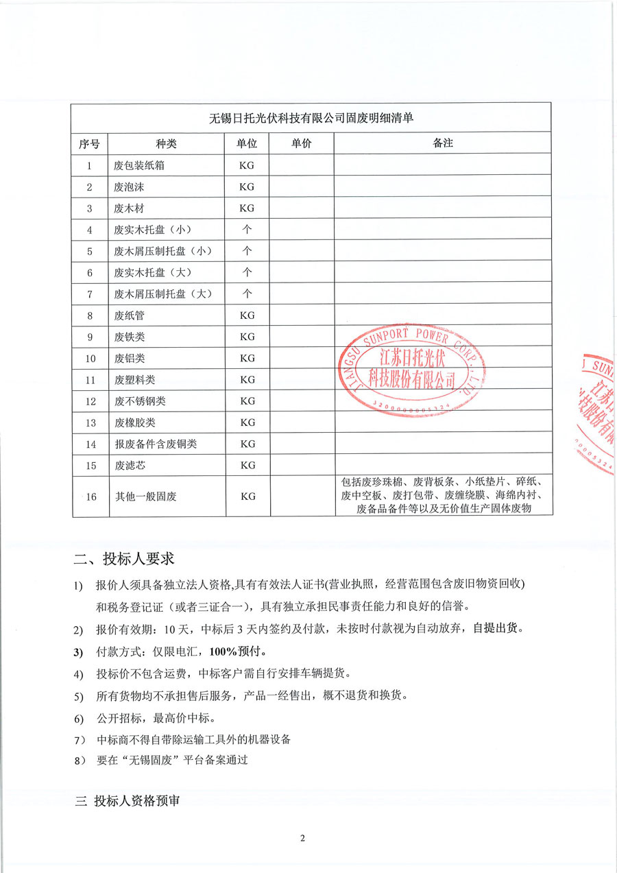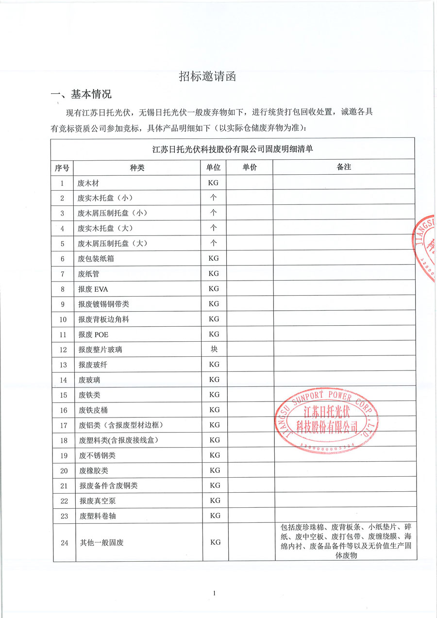 江蘇日托光伏科技股份有限公司現對倉儲部一般固廢實施公開招標。竭誠邀請廣大信譽好、具備廢舊物品回收資質的供應商積極參與投標。