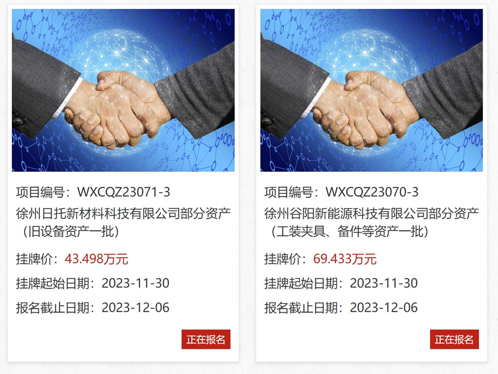 徐州谷陽新能源科技有限公司部分資產(工裝夾具、備件等資產一批)、徐州日托新材料科技有限公司部分資產(舊設備資產一批)招標